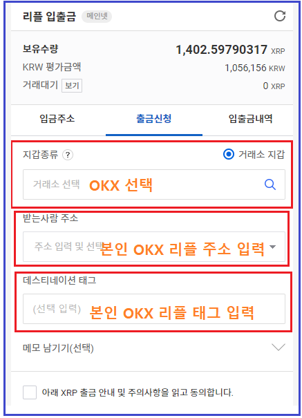 받는 사람 주소에 위의 본인 OKX 리플 주소를