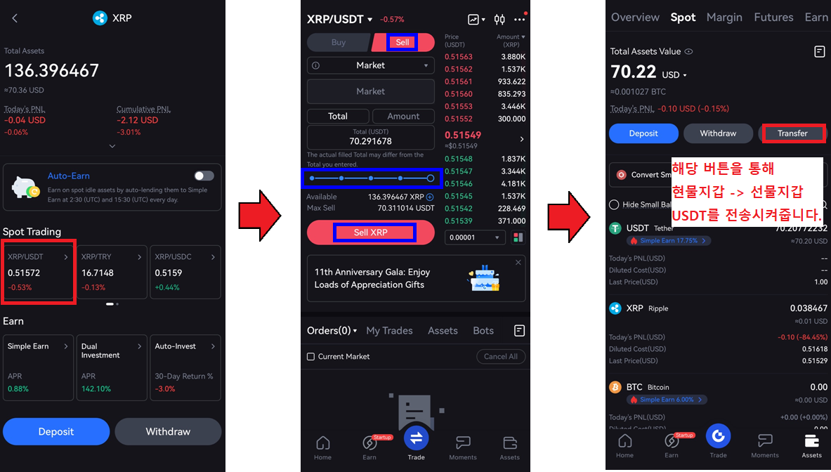 Spot Trading의 XRP/USDT 탭에 들어가서 Sell 버튼 누르시고 Limit(지정가) or Market(시장가) 중에 편하신 걸로 선택하신 다음 'Sell XRP' 리플을 판매해 줍니다.