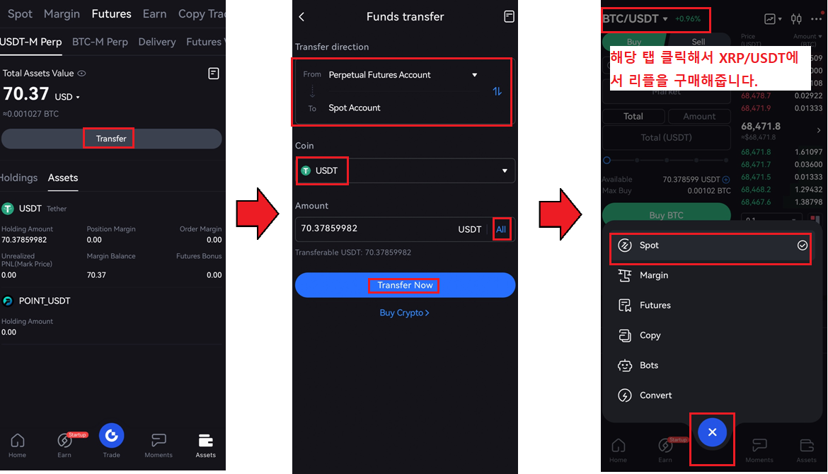 그다음 하단 중앙의 Trade버튼 2번 누르신다음 Spot 들어가셔서 XRP/USDT 페어에서 리플을 구매해 줍니다.