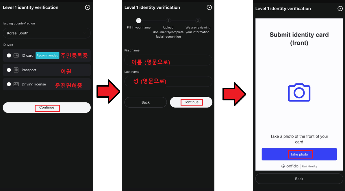 촬영 후 검토하셔서 Upload 버튼 눌러주시고, 뒷면도 똑같이 촬영해 줍니다.